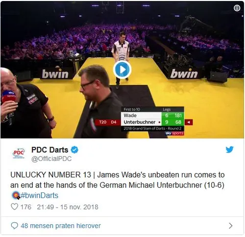 Namens de BDO is Michael Unterbuchner de beste speler op de Grand Slam of Darts 2018 met een plek in de kwartfinale. Gisterenavond versloeg de hij James Wade op overtuigende wijze met 10-6. Maar na afloop sprak men niet alleen over deze prestatie maar ook over een ongemakkelijk moment na de partij waarbij de schrijver van de PDC geen handen wou schudden met de Duitser. De wildste verhalen deden de ronde op social media, maar zoals te zien is in onderstaande video is de reden simpel te verklaren maar toch opmerkelijk. Het bleek namelijk dat zijn stift lekte en dat zijn rechterhand onder de inkt zat na 16 legs schrijven.