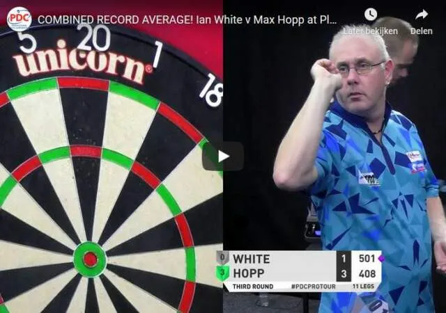 Ian White elkaar bij de laatste 32. Het zou een duel worden waarin het duo een nieuw wereldrecord zou noteren. Met een gecombineerd gemiddelde van maar liefst 230,50 wisten ze een nieuw record in de boeken te krijgen. Nooit eerder werd een dergelijk opgeteld gemiddelde behaald in een partij welke live is uitgezonden. Hierbij gooide Max Hopp 119,20 gemiddeld en Ian White 111,30 gemiddeld. Inmiddels heeft de PDC de beelden van dit duel vrijgegeven en deze zijn hieronder te bekijken.