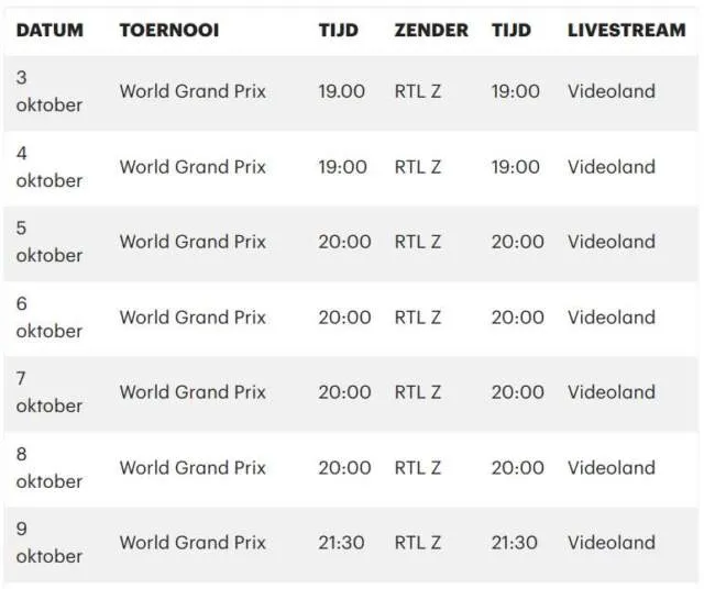 Vanaf zondag wordt de World Grand Prix gespeeld en het toernooi zal live worden uitgezonden op televisie. Normaal is RTL 7 de zender die het toernooi verslaat maar deze keer dien je uit te wijken naar Videoland of RTL Z.