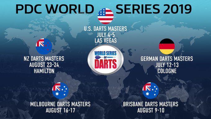 De German Darts Masters zal gehouden worden van 12 tm 13 juli in de LANXESS Arena in Keulen maar begint aan de andere kant van de plas in Las Vegas. In het Mandalay Bay Resort worden de US Darts Masters gehouden van 4 tm 5 juli van 2019. In Augustus vliegen de spelers down under als er drie events gehouden worden in Brisbane, Melbourne en Hamilton.