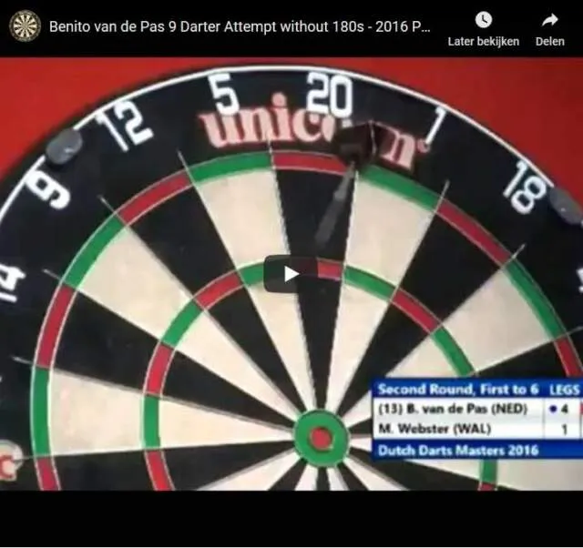 Michael van Gerwen kwam er geen 180-er aan te pas. Omdat het duel van Madhouse, zoals zijn bijnaam luidt, afgelopen week niet op de livestream werd uitgezonden zijn er geen beelden van. Om toch te laten zien hoe deze eruit moet hebben gezien vonden we in het archief unieke beelden van