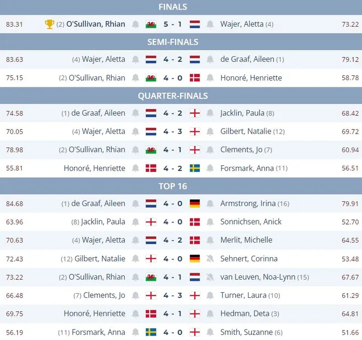 Aileen de Graaf de halve finale waar ze werd verslagen door Aletta Wajer. Het masters toernooi is uiteindelijk gewonnen door Rhian O'Sullivan uit Wales. O'Sullivan won met 5-1 van de Nederlandse Aletta Wajer.