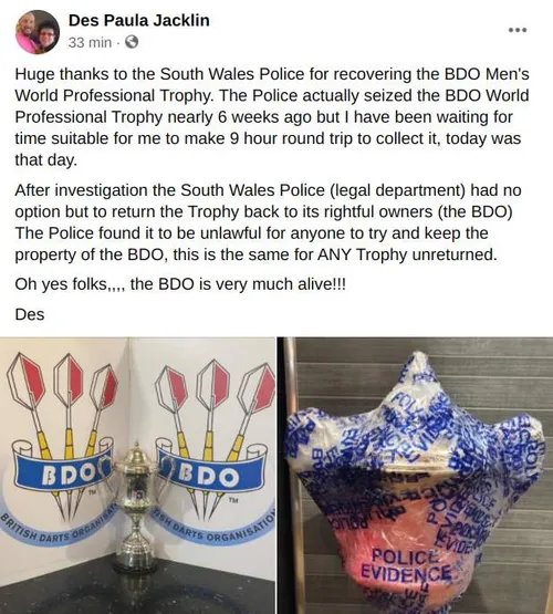 Er was een tijd een strijd gaande tussen Des Jacklin als voorzitter van de BDO en Wayne Warren als de laatste winnaar van het BDO WK. Het ging om de trofee die de 58-jarige in zijn bezit heeft en doorgaans wordt ingeleverd bij de volgende editie van het WK.