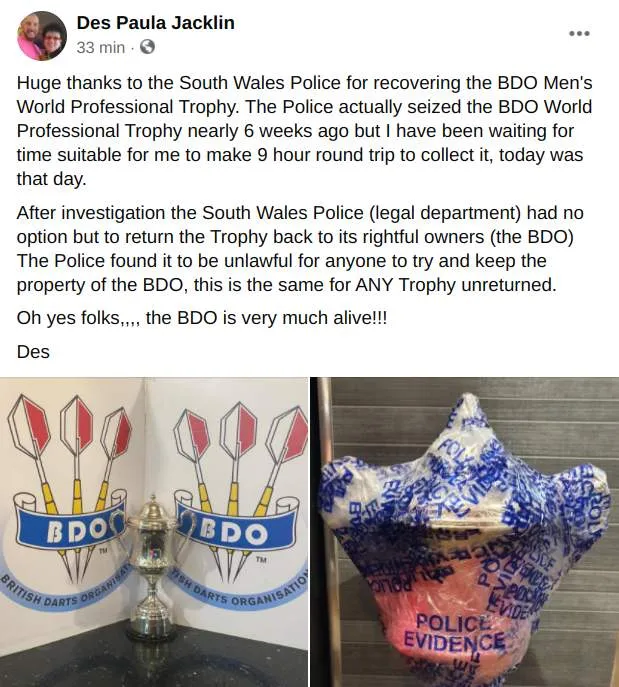 Inmiddels is er een update in deze strijd want Des Jacklin laat weten dat de politie de trofee bij hem heeft teruggebracht.