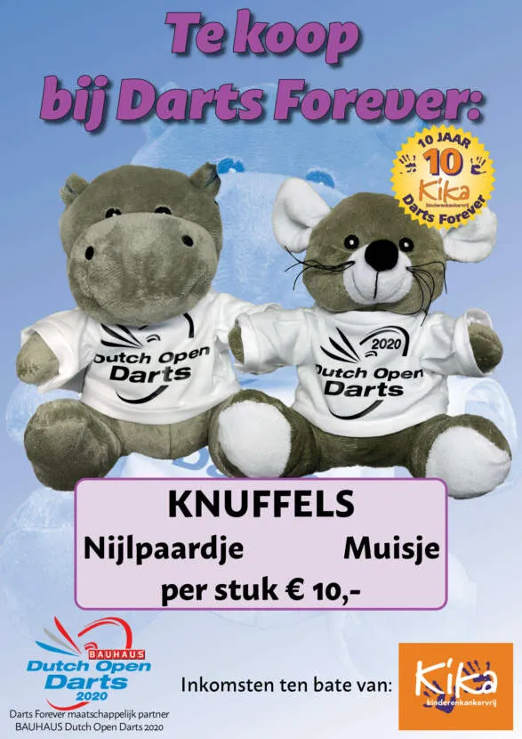 Ieder jaar haalt Darts Forever duizenden euro’s op tijdens de Dutch Open Darts door de verkoop van o.a. knuffels met het shirtje van de Dutch Open en ook kun je in de stand ‘Bullen voor Kika’ waarbij je kans maakt op een VIP pakket voor de Dutch Open Darts 2021.