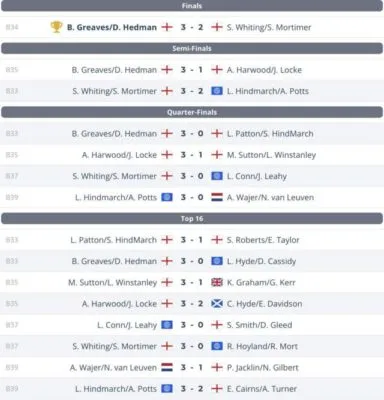 Deta Hedman de titel te pakken dit sterke koppel won met 3-0 van hun landgenoten Sara Mortimer en Sally Whiting. Greaves en Hedman hadden wel een beslissende leg nodig nadat ze van een 2-0 voorsprong Mortimer en Whiting terug zagen komen. Noa-Lynn van Leuven en Aletta Wajer wisten de laatste acht te halen in The Spa.