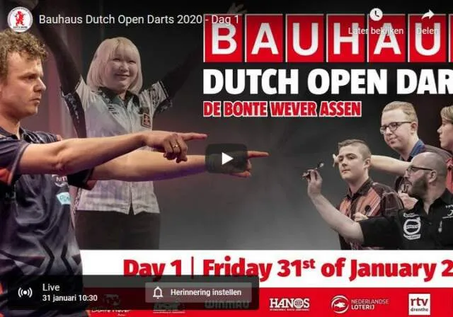Vanaf vrijdag gaat in De Bonte Wever in Assen de Dutch Open 2020 van start. Evenals vorig jaar kun je ook vanuit huis het toernooi op de voet volgen. Uiteraard brengen we namens Dartfreakz weer live updates vanaf locatie maar ook kun je de wedstrijden op de televisiebanen weer volgen via . Uiteraard zullen de podiumwedstrijden op zondag ook weer live worden uitgezonden op RTV Drenthe. Wil je niets missen? Ga naar , klik per dag op 'Herinnering instellen' en je krijgt automatisch een melding zodra de livestream van start gaat.