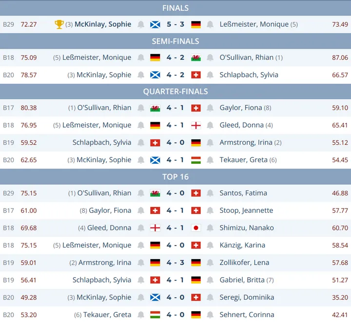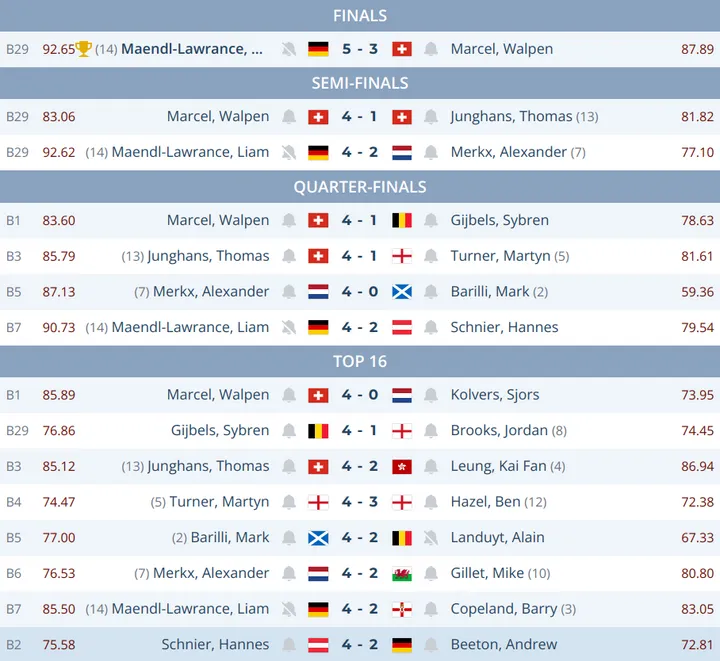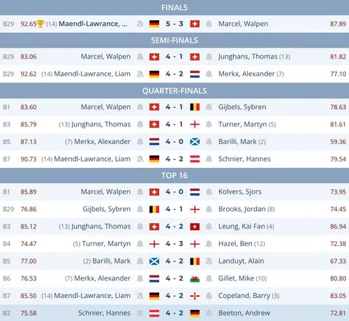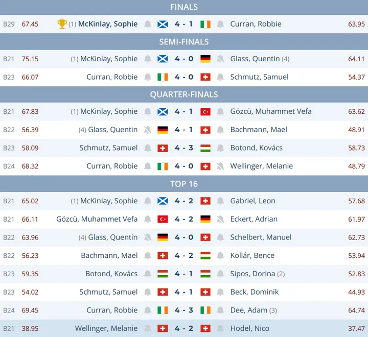 De winst bij de heren ging naar Liam Maendl-Lawrance die in de finale met 5-3 won van Walpen Marcel. De beste Nederlander was Alexander Merkx met een plek in de halve finale waarin hij het aflegde tegen de latere winnaar.