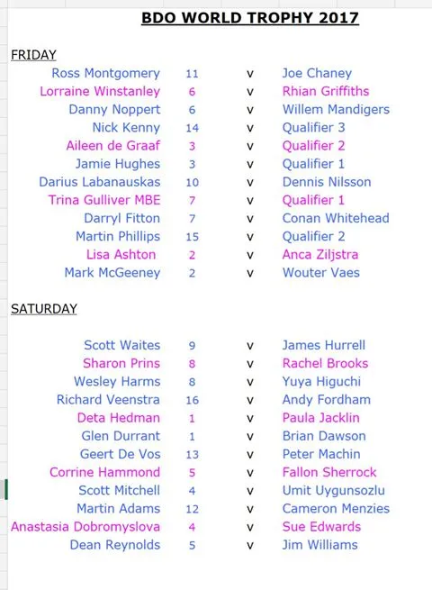 BDO World Darts Trophy is reeds voltrokken en hieronder te bekijken. De qualifiers komen voort uit het kwalificatietoernooi dat op dit moment wordt gespeeld.