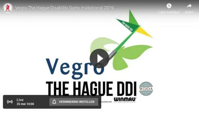 Aankomende zaterdag 25 mei staat de Vegro The Hague Disability Darts Invitational 2019 op het programma. De tweede editie van dit invitatiedartstoernooi voor gehandicapten vindt plaats in de Lourdeskerk te Scheveningen (pal naast het Circustheater). Aan dit toernooi doen zestien topspelers uit binnen- en buitenland mee. Je hoeft ook dit jaar niets te missen van dit toernooi met onderstaande livestream. Klik op 'Herinnering instellen' en je krijgt een melding zodra de livestream start. Een overzicht met alle informatie omtrent dit toernooi lees je terug in .
