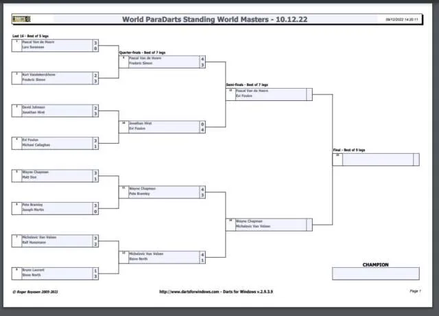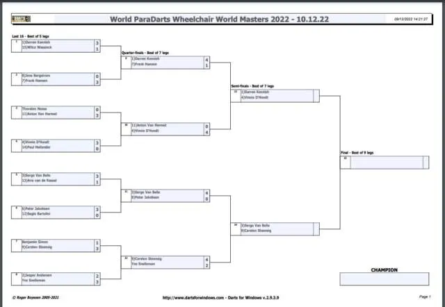 Op vrijdag werd in de Bonte Wever te Assen de knock-out toernooien gespeeld van de World Masters paradarts. Met onder andere een 116-finish wist Michelovic van Velzen zich te verzekeren van een halve finale plek op zaterdag. Ook Pascal van der Hoorn uit Almere heeft zich door de knock-out weten te wurmen.