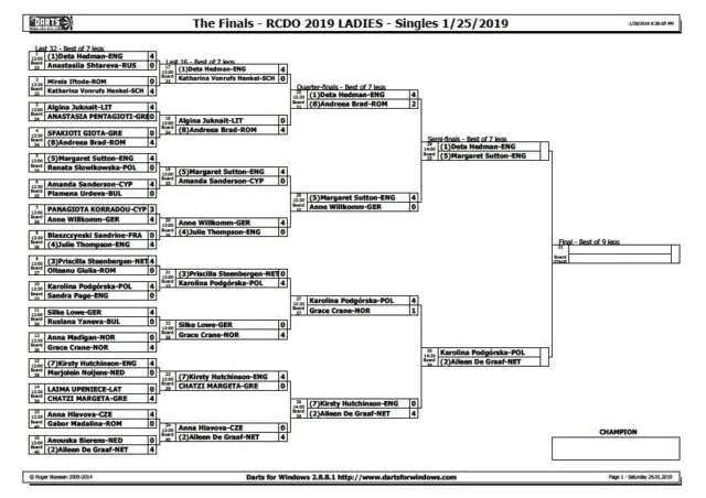 Aileen de Graaf eveneens de halve finale te halen. Deze werd wel al op zaterdag gespeeld en hierin was Karolina Podgorska met 4-3 te sterk voor de Hollandse. De Poolse zal morgen in de damesfinale spelen tegen Maggie Sutton die op haar beurt won van