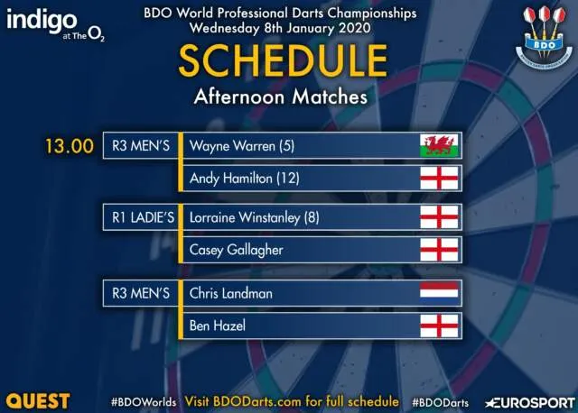 Vanmiddag gaat het BDO WK weer verder waarbij 's middags Chris Landman in actie zal komen. Hij treft Ben Hazel in de laatste partij van de middagsessie. Daarvoor zal het de beurt zijn aan