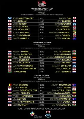 Zojuist heeft de BDO het speelschema van de eerste ronde BDO World Trophy bekend gemaakt. Dit toernooi vindt plaats van woensdag 30 mei tot en met zondag 3 juni. Sharon Prins en Aileen de Graaf komen op de openingsavond direct in actie. Donderdags zien we Wesley Harms, Anca Zijlstra, Chris Landman en Derk Telnekes in actie. Willem Mandigers en Jeffrey Sparidaans komen op vrijdag als laatste Nederlanders in actie.
