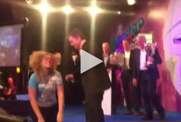 Aileen de Graaf. Bij het ophalen van haar trofee ging ze namelijk onderuit op de trap van het podium. Ze kon er wel om lachen en met hulp van Richard Ashdown werd ze weer overeind geholpen en werd alsnog de grootste trofee in ontvangst genomen. Beelden van deze duikeling zijn hieronder te bekijken.