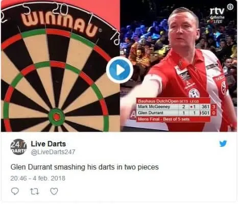 Glen Durrant zag zijn pijl in de triple 20 belanden maar tegelijkertijd brak deze in tweeën. Iedereen zal het weleens hebben meegemaakt maar op het grote podium een pijl in tweeën zien breken terwijl de barrel en de punt in het bord blijft zitten hadden we, voor zover bekend, nog niet eerder gezien. Hieronder zie je de beelden van dit opvallend moment dat ook alweer snel bleek te zijn opgelost.